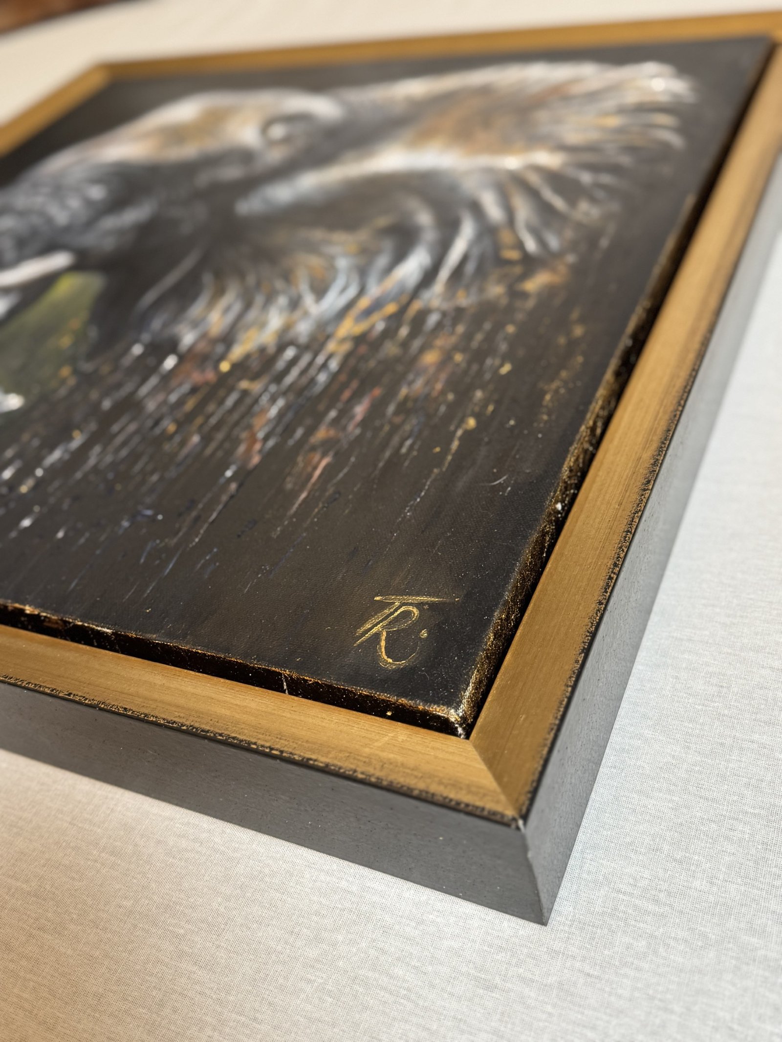 An old elephant stands with quiet majesty, each wrinkle and fold of its skin telling the story of a lifetime in the wild. Its eyes carry the weight of experience, wisdom, and memories of distant landscapes. Textured brushstrokes bring depth and movement, capturing both the strength and gentle vulnerability of this ancient creature. The painting is a tribute to resilience, grace, and the enduring spirit of the natural world.
