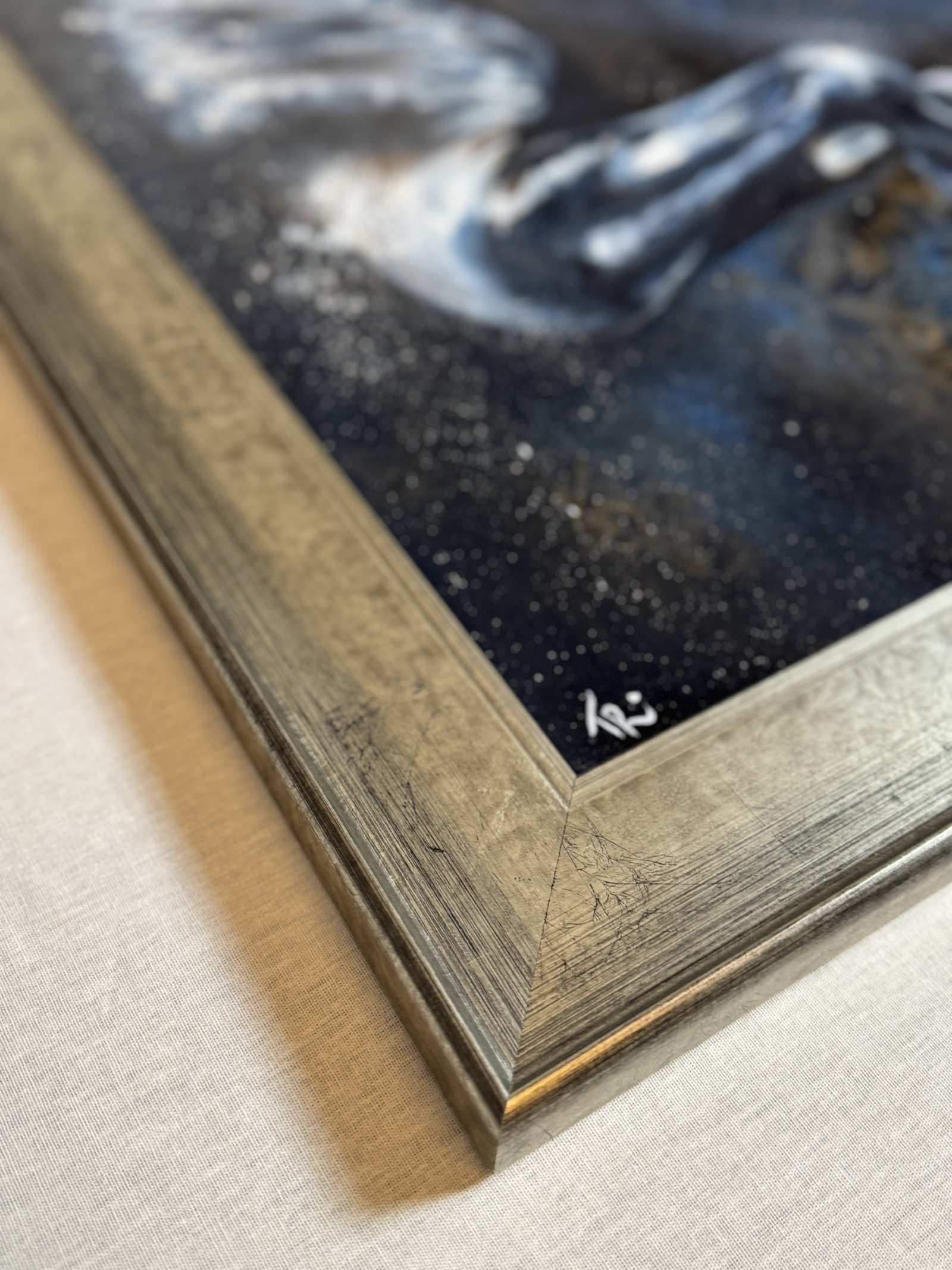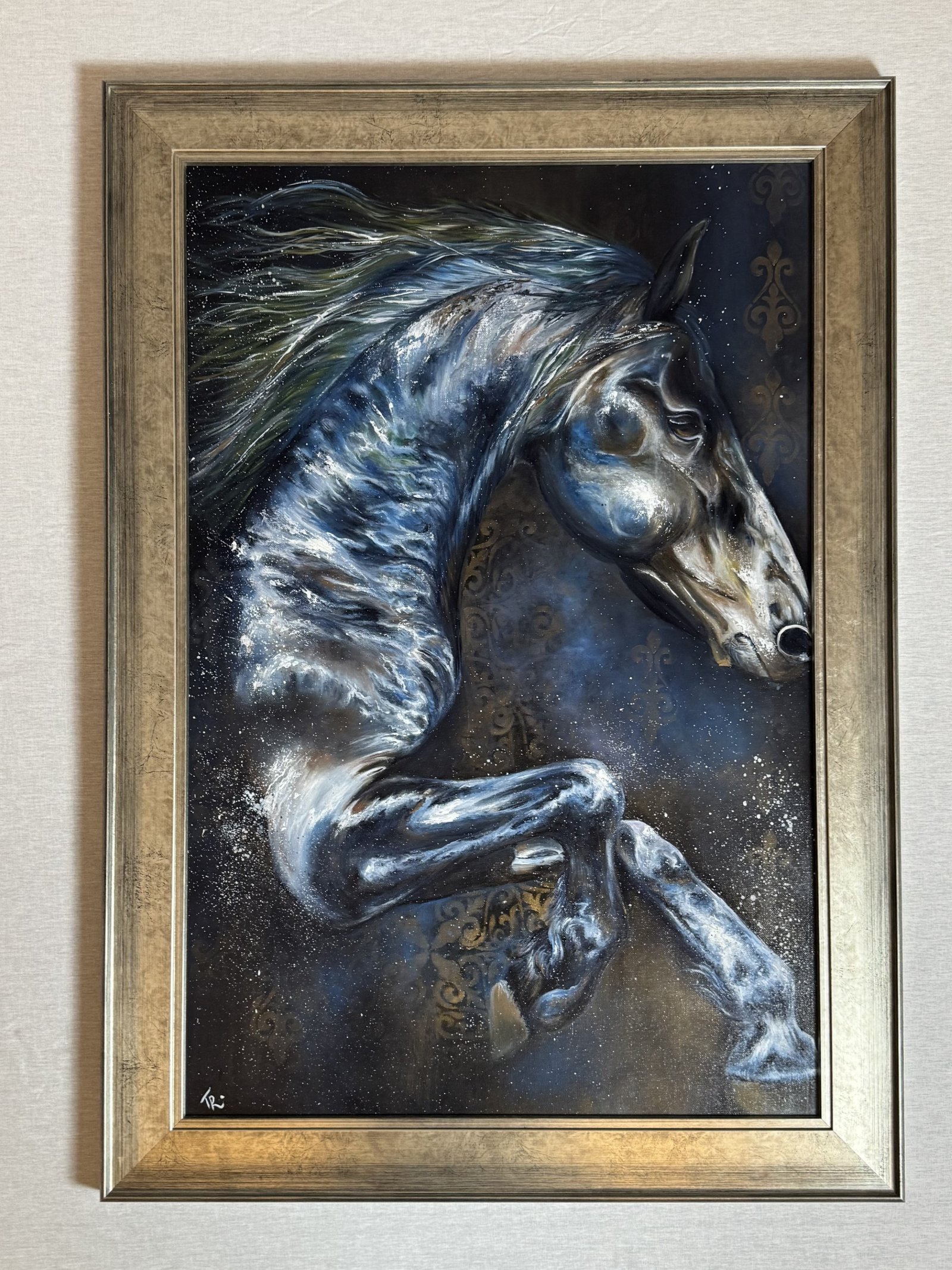 A dark horse races through the night, its mane and muscles captured in a blur of movement and energy. Shadows and moonlight play across its powerful form, highlighting the tension, grace, and raw freedom of the animal. Through textured brushstrokes and layered oils, the painting conveys both speed and strength, evoking the mystery and wildness of a creature in its untamed element.