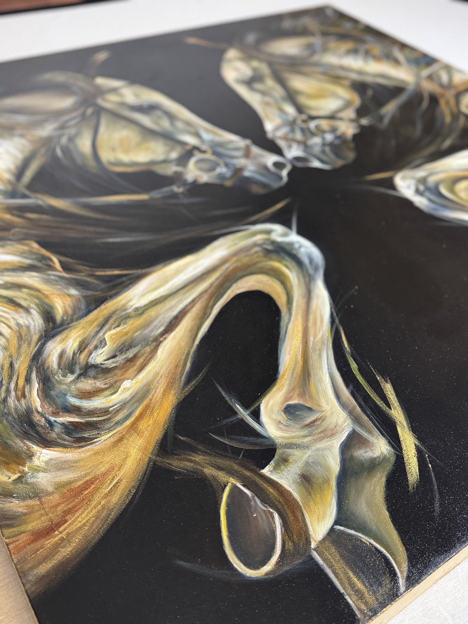 A sweeping oil canvas holds two identical horses, poised like mirrored spirits, facing one another in silent communion. Their forms rise from the brushstrokes as if summoned from mist with muscles carved in amber light, coats shimmering with the soft glow of dawn. Their manes drift backward like dark silk caught in a gentle wind, each strand painted with the tender patience of an artist listening to the heartbeat of the scene.