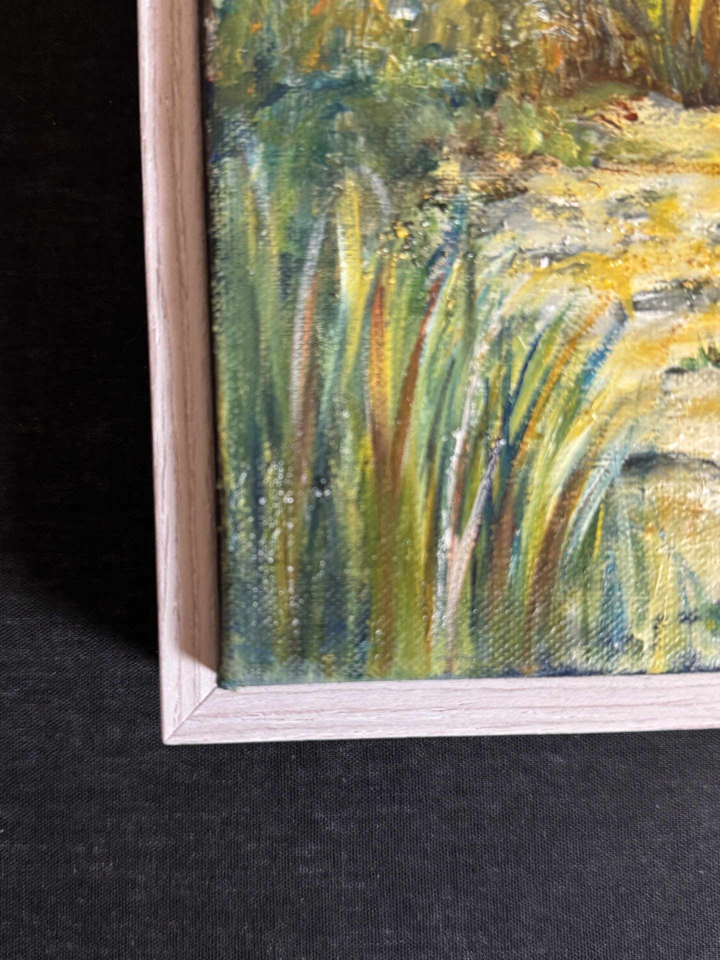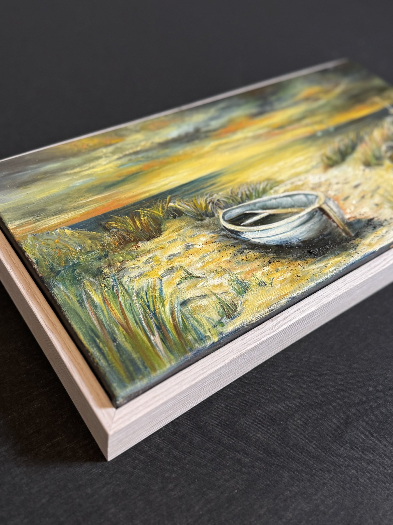 A solitary boat rests quietly on the sand, bathed in the warm, golden glow of the setting sun. Gentle reflections shimmer across the shoreline. The painting captures the stillness of this fleeting moment—the hush of the tide, the soft textures of sand and wood, and the serene beauty of day’s end. It is a meditation on calm, solitude, and the gentle rhythm of nature.