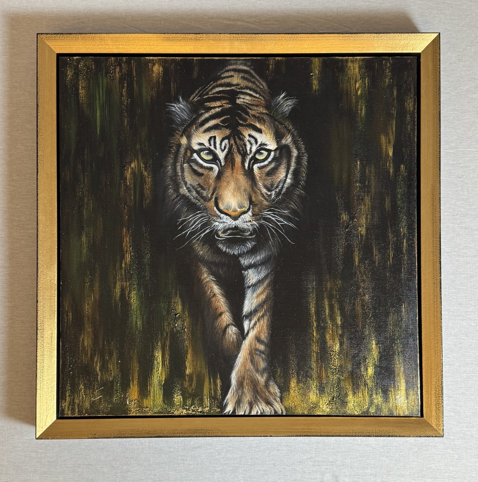 A tiger steps from the shadows, its gaze fierce and penetrating, every muscle and stripe alive with tension and movement. The darkness around it heightens its presence, making the animal’s colours and form almost luminous against the night. Through textured brushwork and dynamic strokes, the painting captures both the raw power and silent grace of this magnificent predator, evoking a moment of quiet intensity and primal beauty.