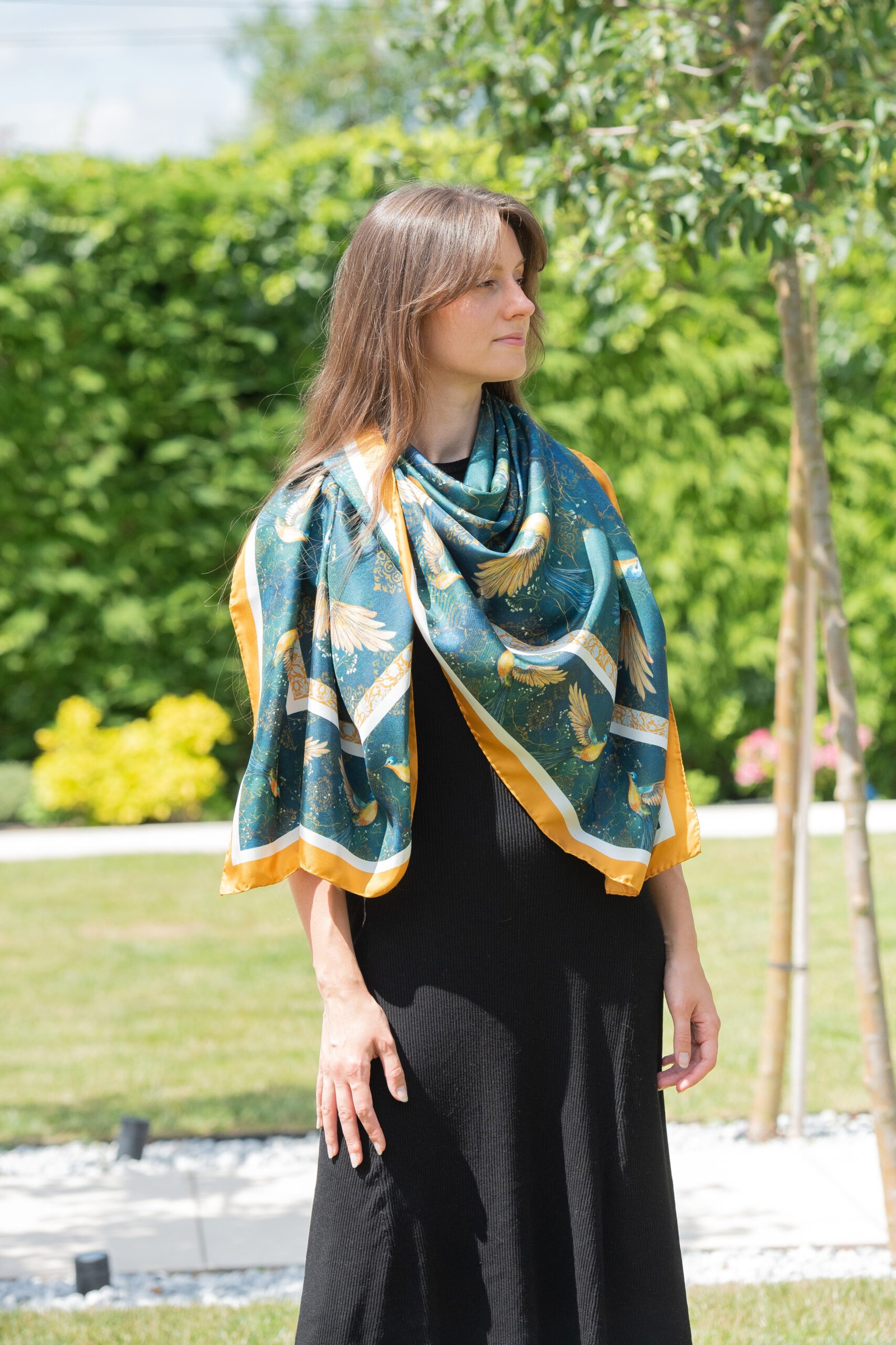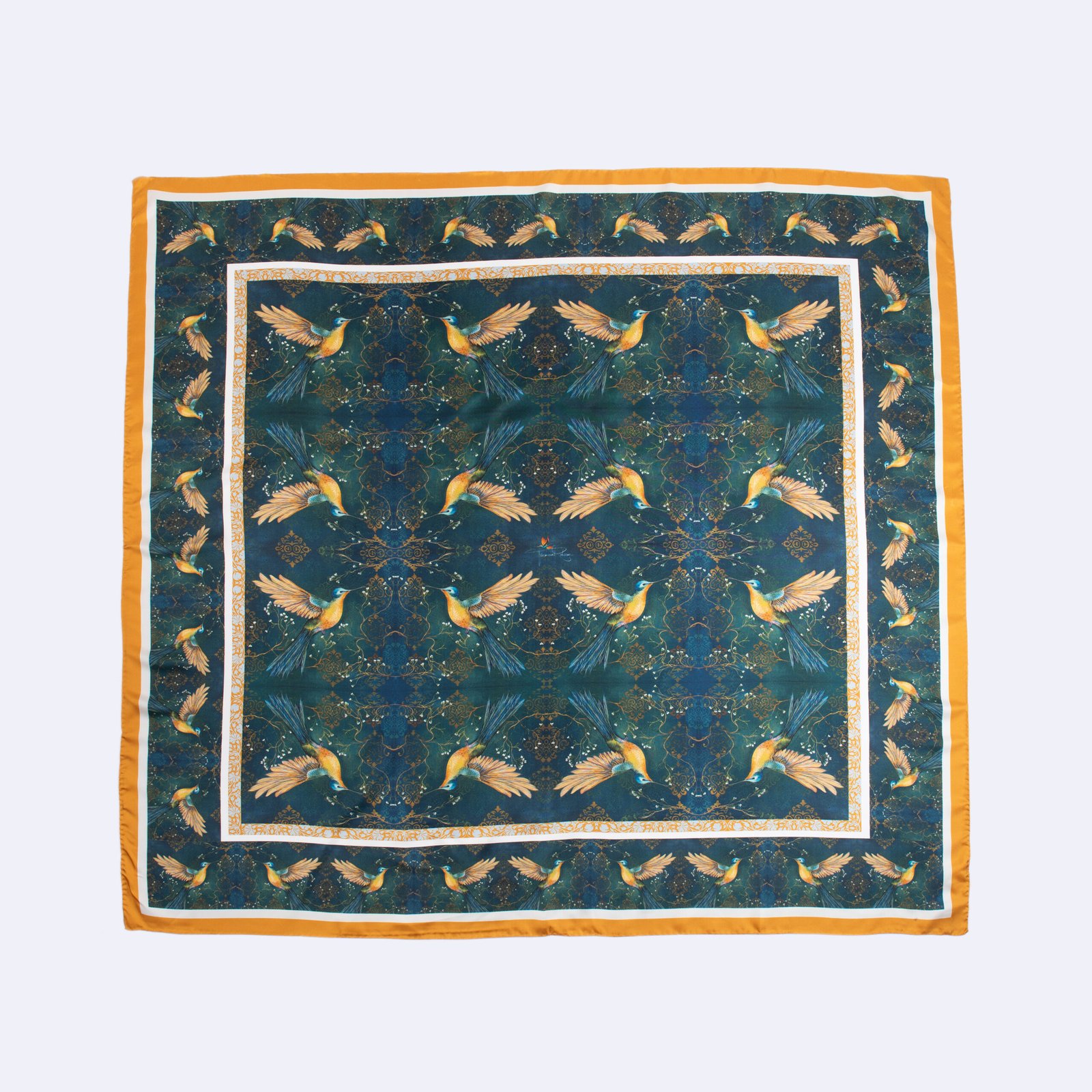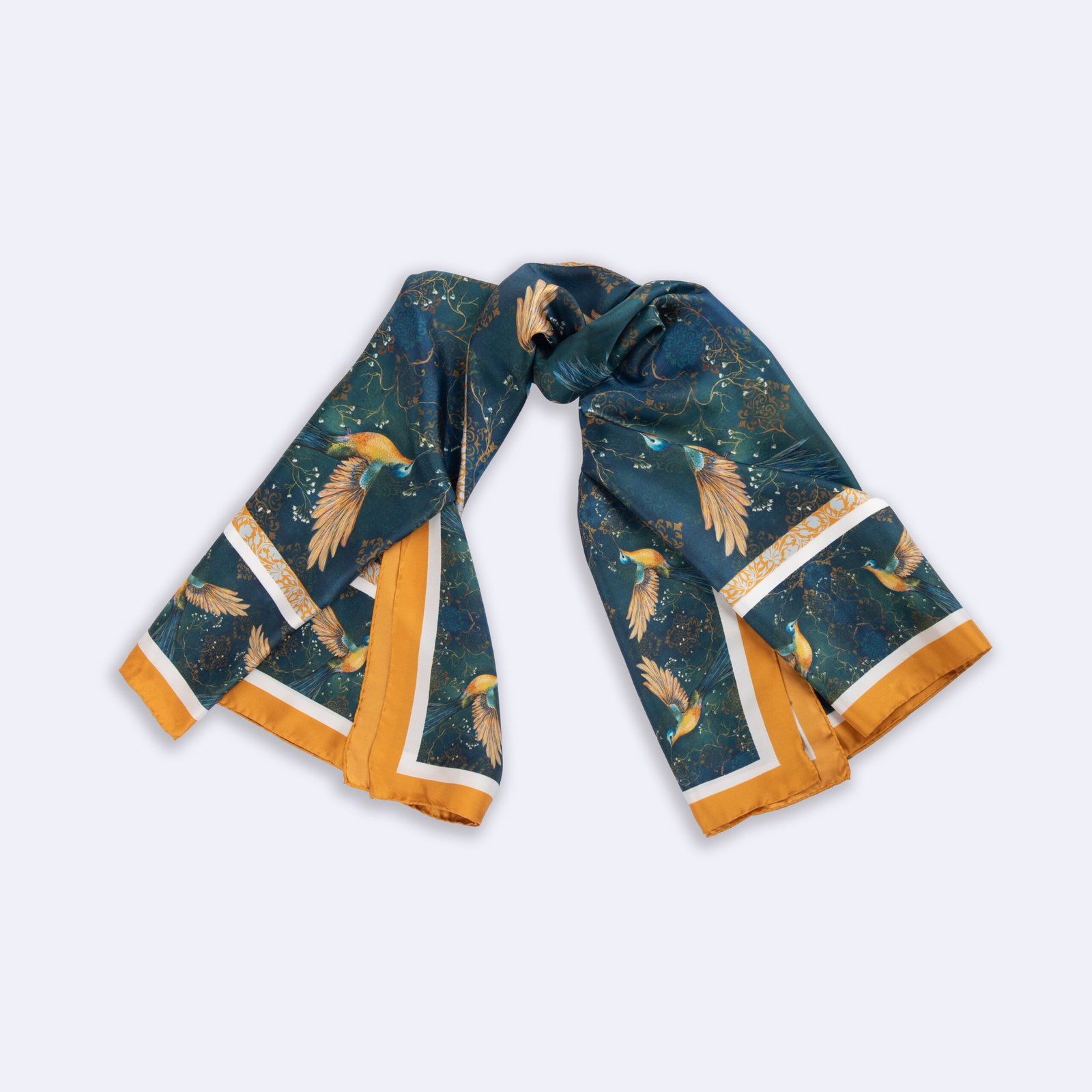 This silk twill scarf transforms your original painting into a luminous piece of wearable art, featuring a radiant hummingbird suspended in a midnight sky.