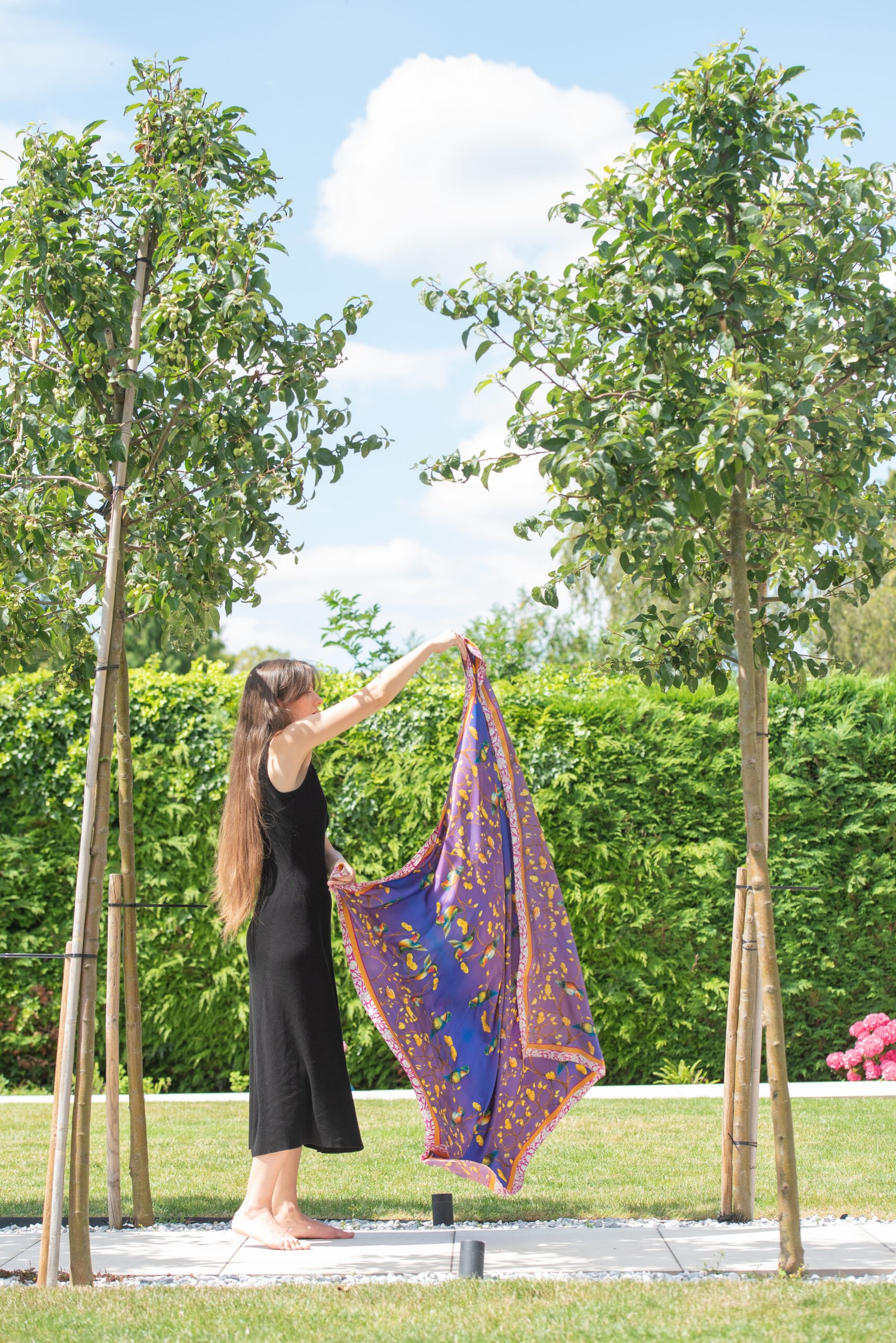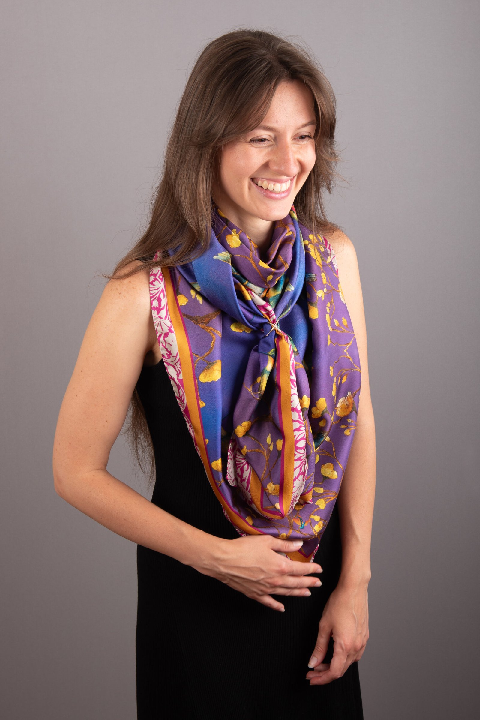 Crafted from 100% silk twill, the scarf offers a smooth yet textured feel, a subtle sheen, and a graceful drape that brings the painting’s colours and brushstrokes to life. Hand-finished edges complete the piece with refined craftsmanship.